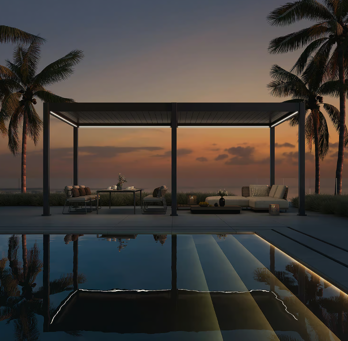Door het elektrische lamellen dak, heb je altijd de keuze of je in de zon of in de schaduw wilt zitten. De lamellen kunnen 135 graden kantelen waardoor je zeer flexibel bent in het doorlaten van zonlicht. Wanneer het lamellen dak dicht zit, dan is de overkapping 100% waterdicht doordat het water via het geïntegreerde waterafvoersysteem wordt afgevoerd. De overkapping sluit je gemakkelijk aan op een 220V stopcontact. De LED verlichting zorgt voor een aangename en warme sfeer tijdens de avonduren. Het elektrisch lamellen dak en de LED verlichting bedien je gemakkelijk met de afstandsbediening en via de app op je mobiele telefoon of tablet.